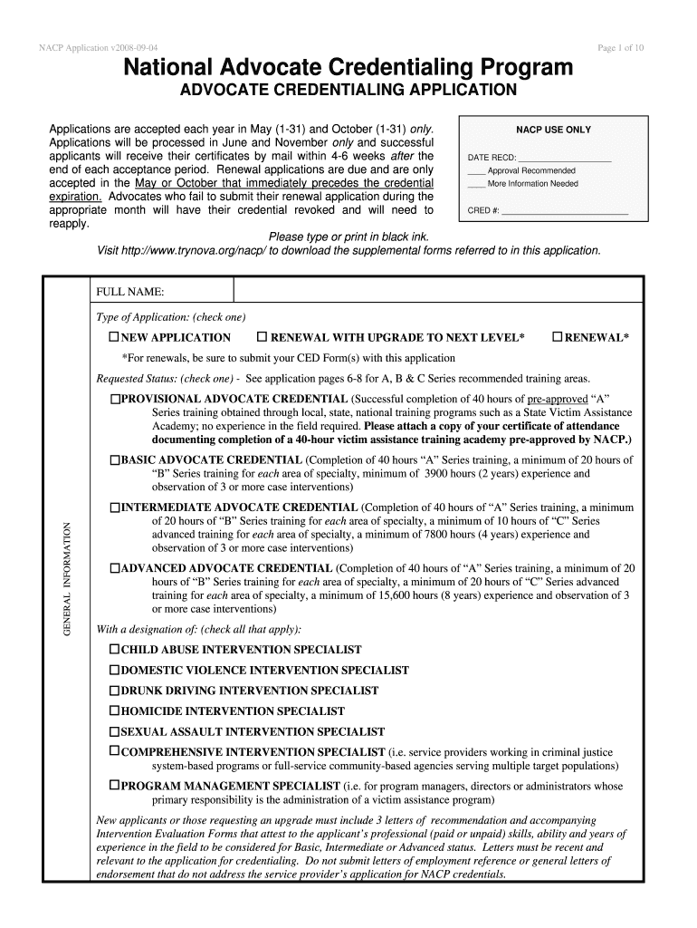 National Advocate Credentialing Program® Apply for the NACP to become a Credentialed Advocate. NACP promotes a minimum of 40 hours of pre-service training, recognizes previous years of paid or volunteer advocacy experience, and requires continuing education for all NACP-credentialed advocates.