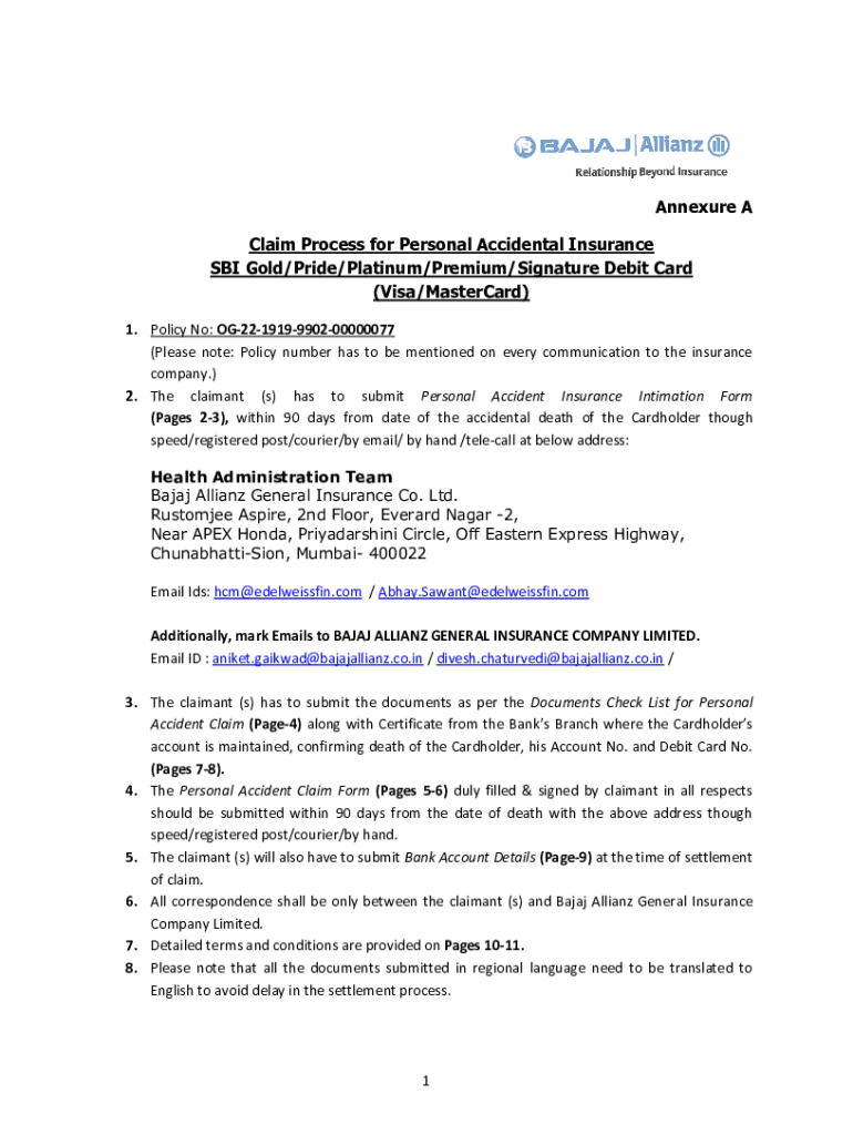 Appendix A Claim Process for Personal Accidental Insurance SBI Gold/Pride/Platinum/Premium/Signature Debit Card (Visa/MasterCard) 1. Policy No: OG221919990200000077 (Please note: Policy number has