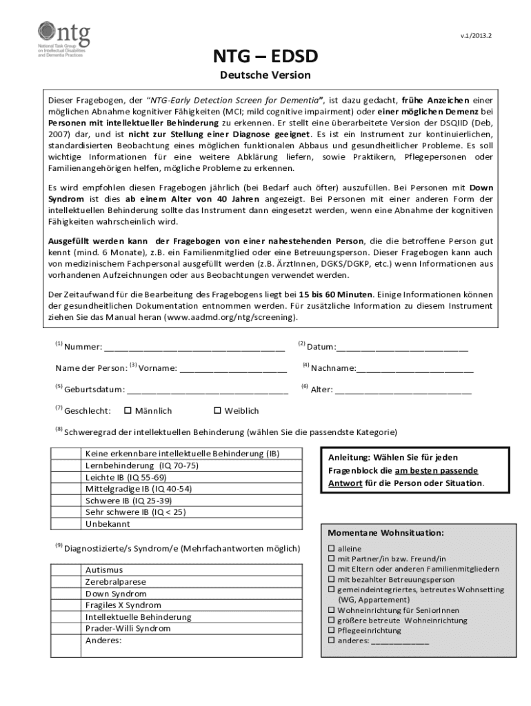 V.1/2013.2NTGEDSDDeutscheVersionDieser Fragebogen, her Nearly Detection Screen for Dementia, is daze redact, free Attached anger