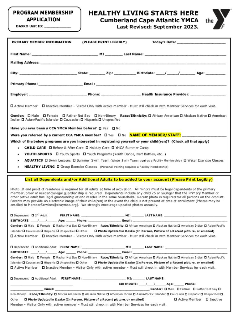 PROGRAM MEMBERSHIP APPLICATIONHEALTHY LIVING STARTS HERE Cumberland Cape Atlantic YMCA Last Revised: September 2023.DAX KO Unit ID: ___PRIMARY MEMBER INFORMATION(PLEASE PRINT LEGIBLY)Today's Date: