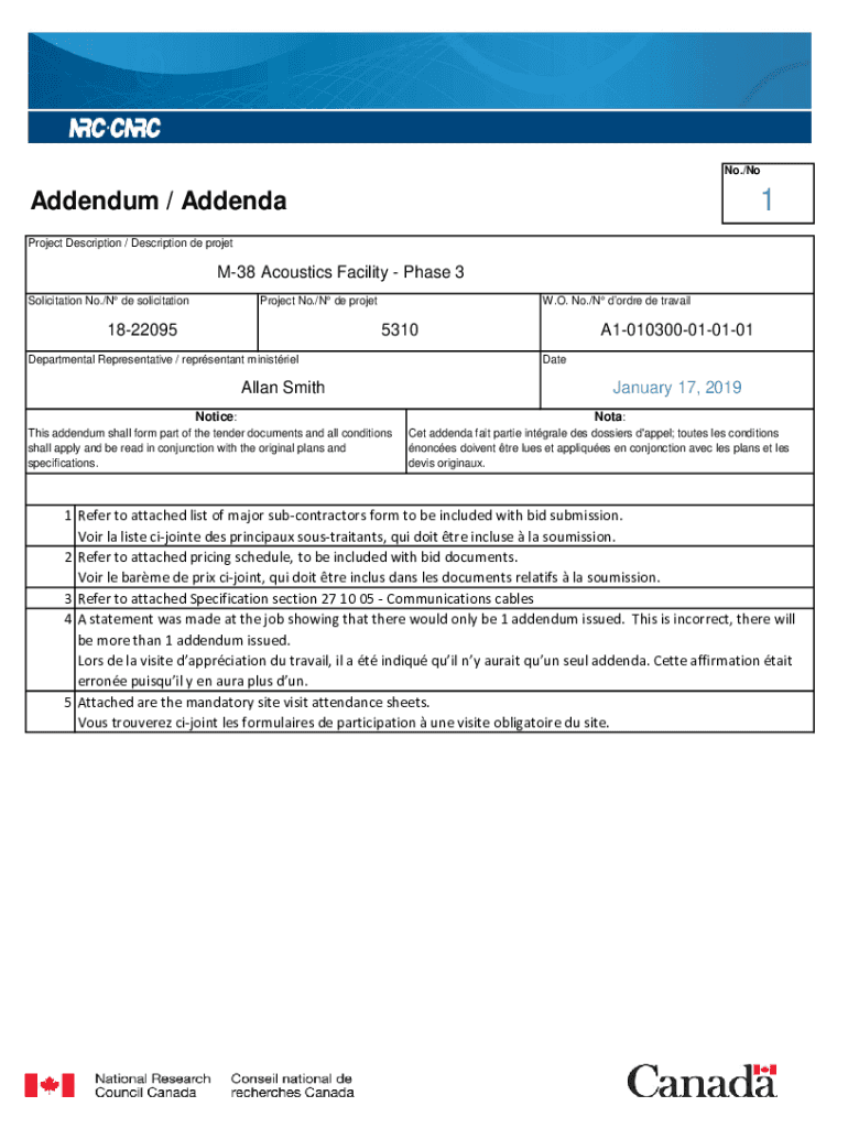 No./No1Addendum / Addenda Project Description / Description de projetM38 Acoustics Facility Phase 3 Solicitation No./N de solicitationProject No./N de projet1822095W. O. No./N order de travail5310Departmental