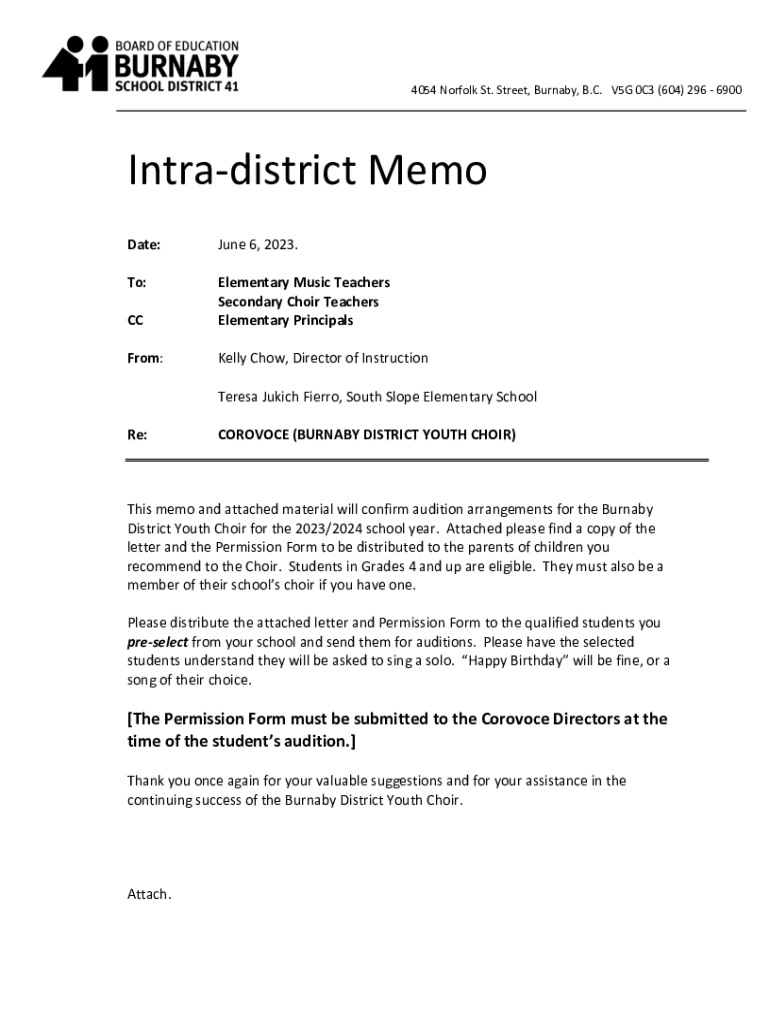 4054 Norfolk St. Street, Burnaby, B.C. V5G 0C3 (604) 296 6900Intradistrict Memo Date:June 6, 2023. To: Elementary Music Teachers Secondary Choir Teachers Elementary PrincipalsFrom:Kelly Chow, Director