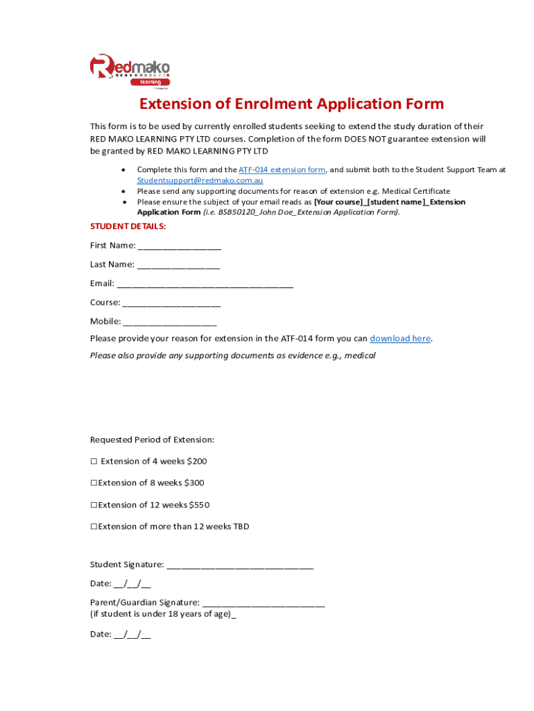 Extension of Enrollment Application Form This form is to be used by currently enrolled students seeking to extend the study duration of their RED MAKE LEARNING PTY LTD courses. Completion of the form