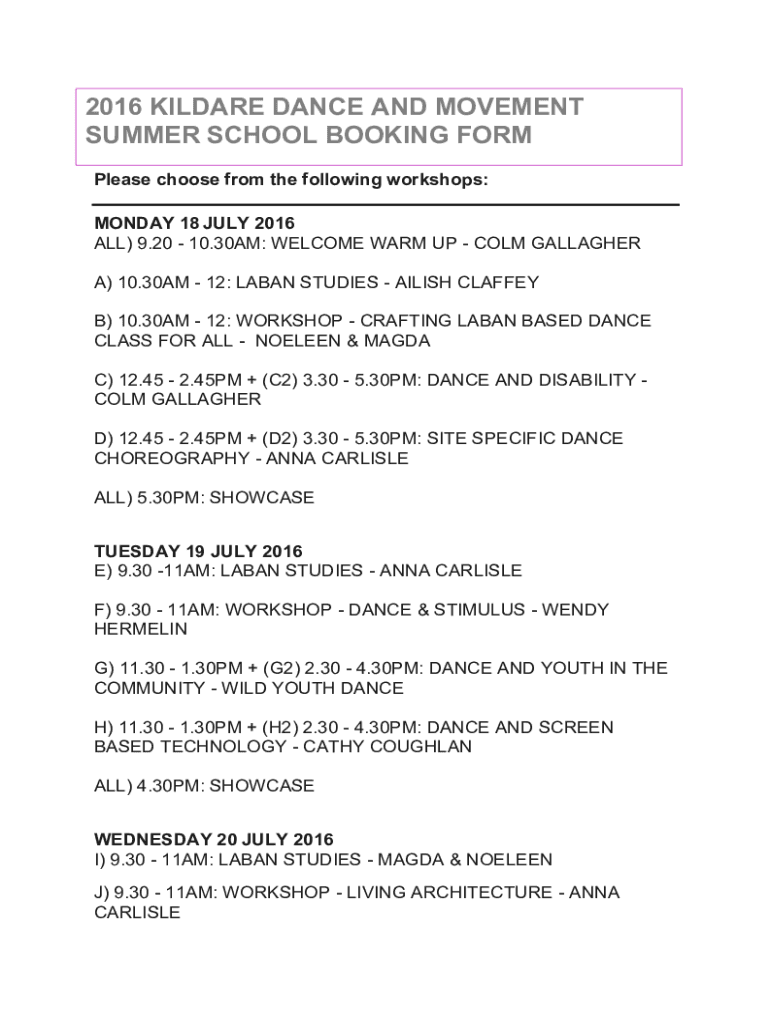 2016 KILDARE DANCE AND MOVEMENT SUMMER SCHOOL BOOKING FORM Please choose from the following workshops: MONDAY 18 JULY 2016 ALL) 9.20 10.30AM: WELCOME WARM UP COLD GALLAGHER A) 10.30AM 12: LABAN STUDIES