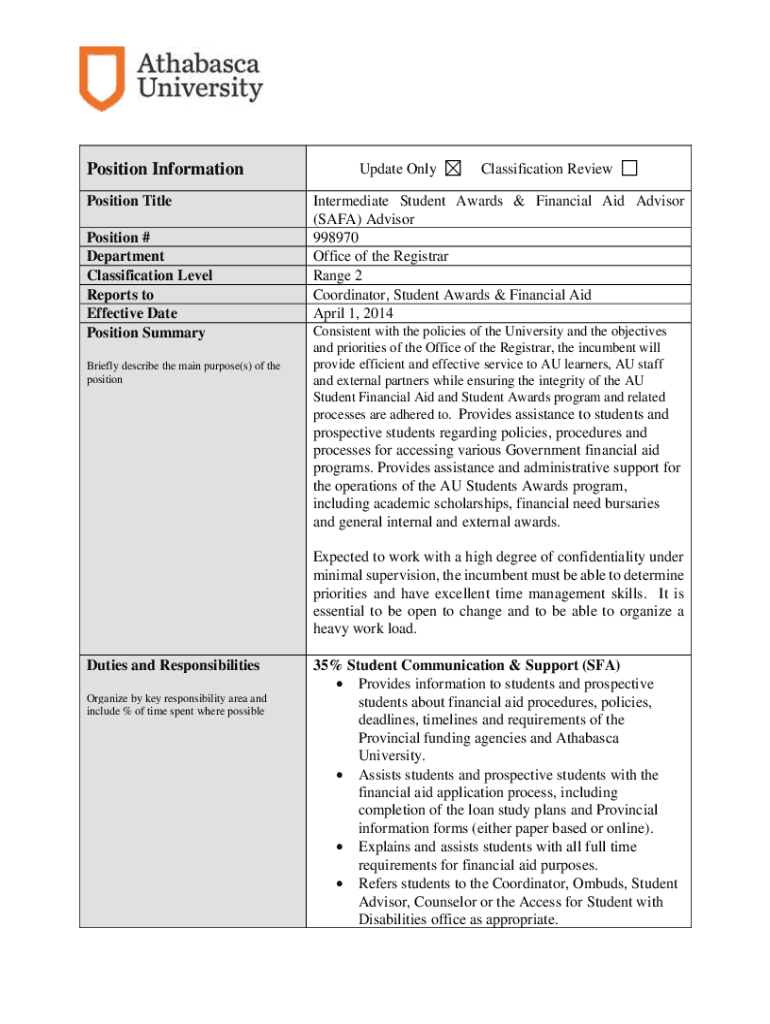 Position Information Position Title Position # Department Classification Level Reports to Effective Date Position Summary Briefly describe the main purpose(s) of the positionUpdate OnlyClassification