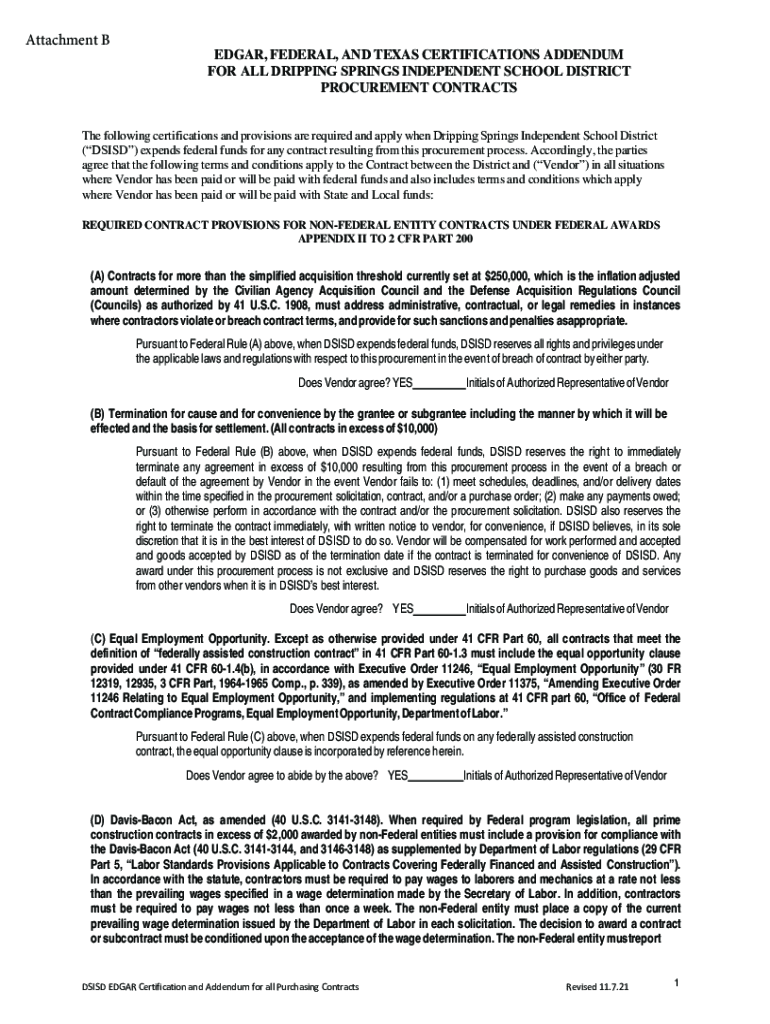 Attachment EDGAR, FEDERAL, AND TEXAS CERTIFICATIONS ADDENDUM FOR ALL DRIPPING SPRINGS INDEPENDENT SCHOOL DISTRICT PROCUREMENT Contracts following certifications and provisions are required and apply