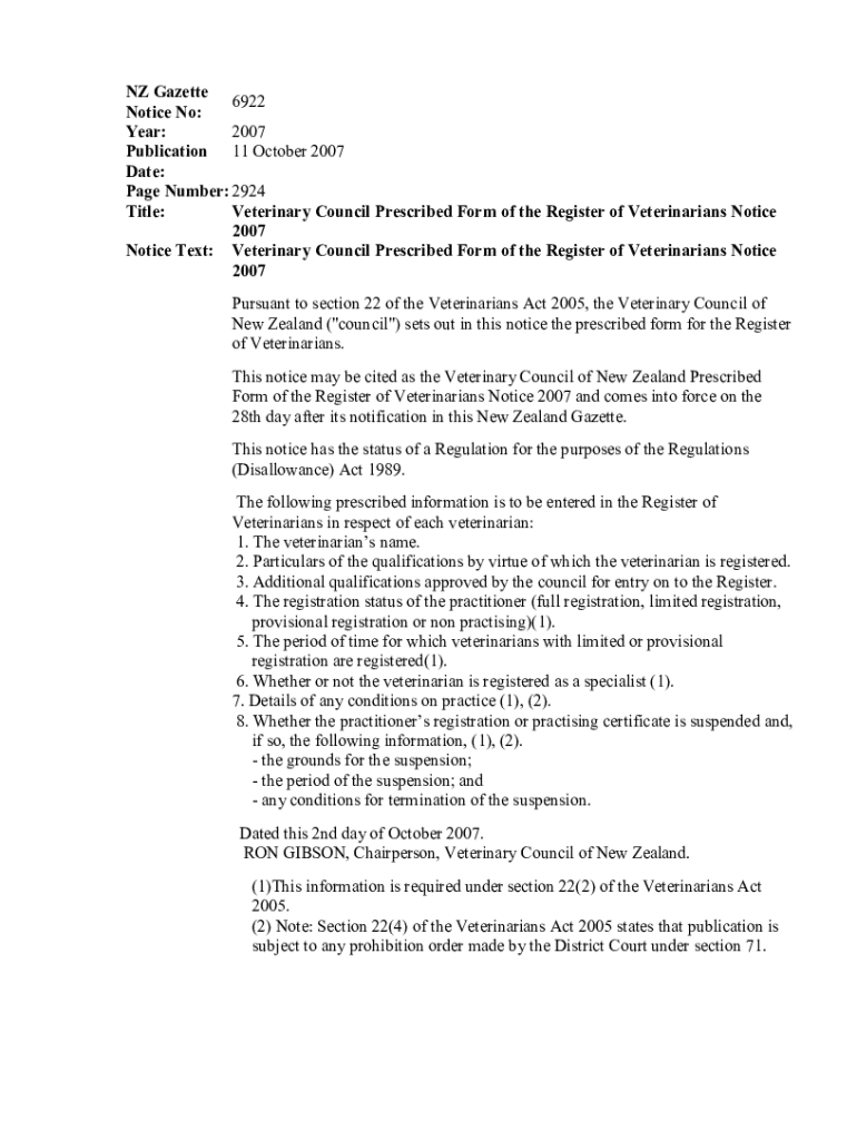NZ Gazette 6922 Notice No: 2007 Year: Publication 11 October 2007 Date: Page Number: 2924 Title: Veterinary Council Prescribed Form of the Register of Veterinarians Notices 2007 Notice Text: Veterinary