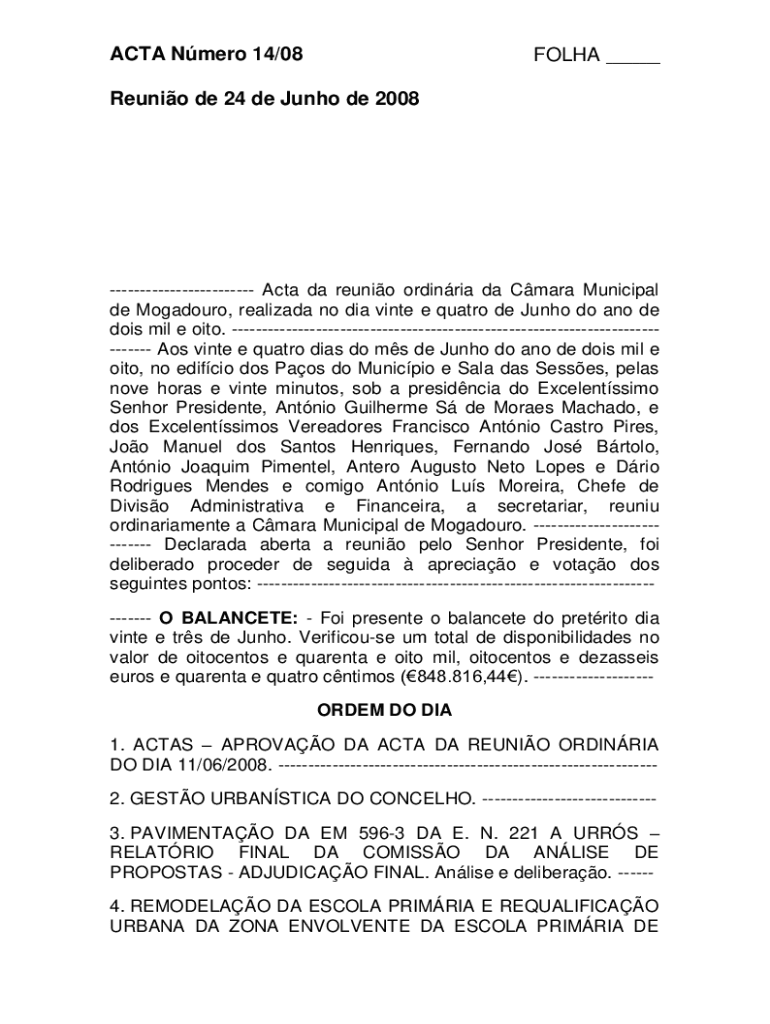 ACTA Nero 14/08FOLHA ___Reunion de 24 de Juno de 2008 ACTA the reunion ordinary the Clara Municipal de Mogadouro, realized no did vine e quarto de Juno do an ode does mil e onto. AOS vine e quarto