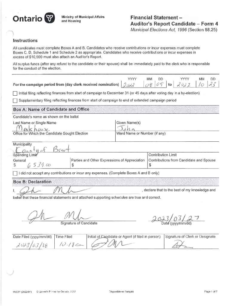 Ontario(financial Statement Auditor\'s Report Candidate Form 4Ministry of Municipal Affairs and HousingMunicipal Elections Act, 1996 (Section 88 .25)Instructions All candidates must complete Boxes