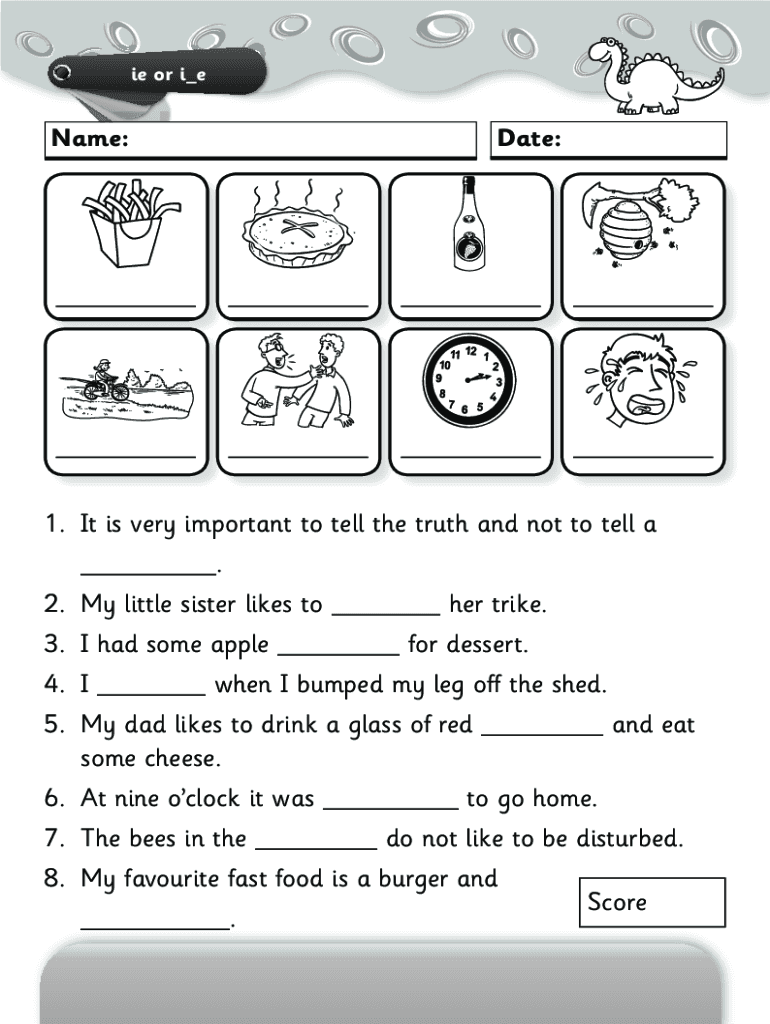 IE or i_eName:Date:1. It is very important to tell the truth and not to tell a ___. 2. My little sister likes to ___ her trike. 3. I had some apple ___ for dessert. 4. I ___ when I bumped my leg off