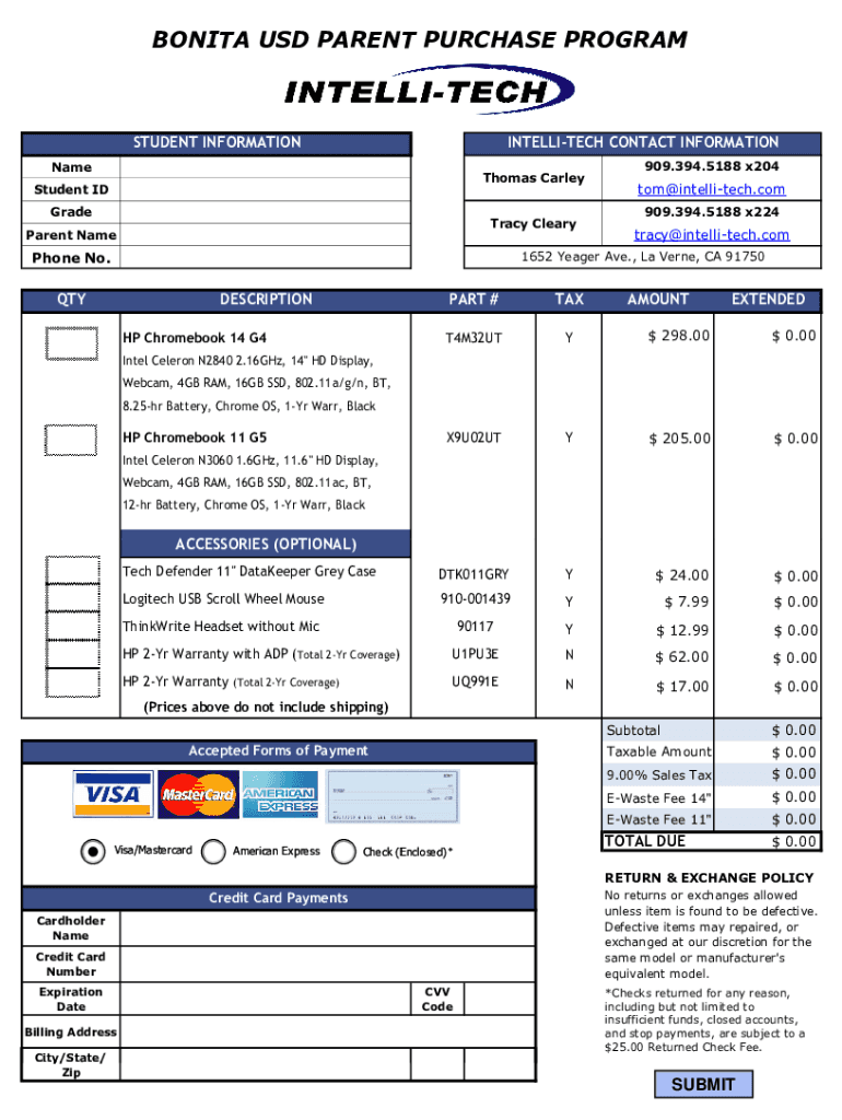 BONITA USD PARENT PURCHASE PROGRAMSTUDENT INFORMATIONINTELLITECH CONTACT INFORMATIONNameThomas CarleyStudent ID