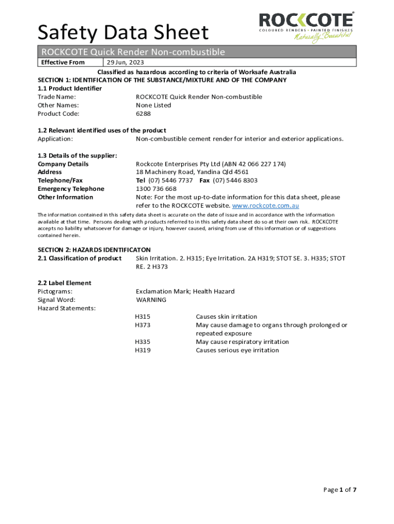 Safety Data Sheet ROCKET Quick Render Noncombustible Effective From29 Jun, 2023 Classified as hazardous according to criteria of Work safe Australia SECTION 1: IDENTIFICATION OF THE SUBSTANCE/MIXTURE