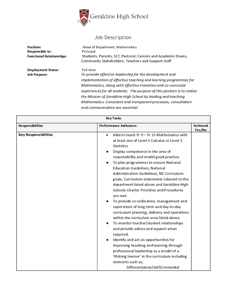Job Description Position: Responsible to: Functional Relationships:Employment Status: Job Purpose:Head of Department, Mathematics PrincipalStudents, Parents, SLT, Pastoral, Careers and Academic Deans,