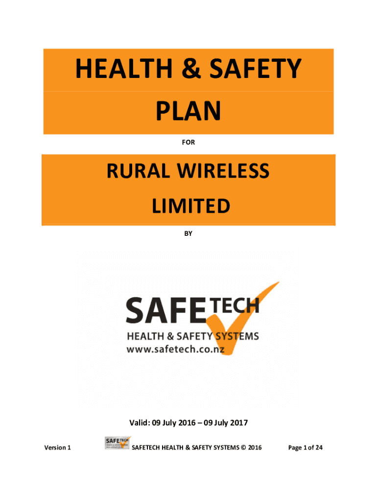 HEALTH & SAFETY PLAN FORMAL WIRELESS LIMITED Valid: 09 July 2016 09 July 2017 Version 1SAFETECH HEALTH & SAFETY SYSTEMS 2016Page 1 of 24TABLE OF CONTENTS PART ONE 1Introduction42Statement of Intent43Rural