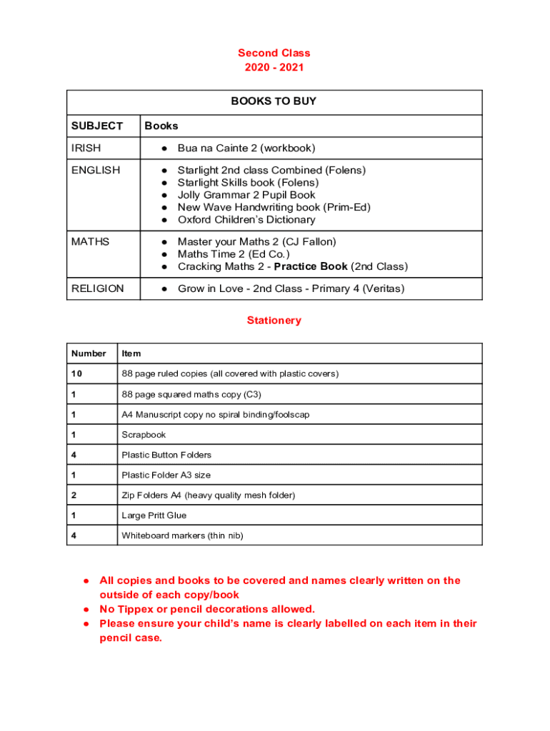 SUBJECTBooksIRISH BUA Na Caine 2 (workbook)ENGLISH