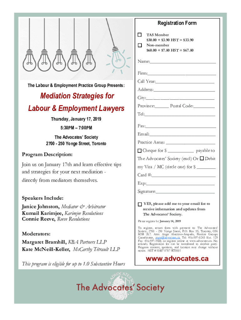 Registration Form TAS Member $30.00 + $3.90 HST $33.90 Nonmember $60.00 + $7.80 HST $67.80Name:___ Firm:___ The Labor & Employment Practice Group Presents:Mediation Strategies for Labor & Employment