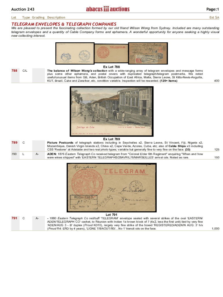 Auction 243 Lot Page:1Type Grading Descriptions TELEGRAM ENVELOPES & TELEGRAPH Companies are pleased to present the fascinating collection formed by our old friend Wilson Wong from Sydney. Included
