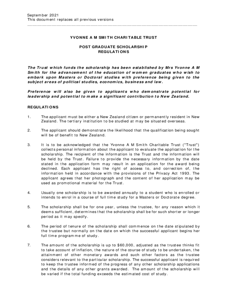 September 2021 This document replaces all previous versions ___ YVONNE A M SMITH CHARITABLE TRUST POST GRADUATE SCHOLARSHIP Regulations Trust which funds the scholarship has been established by Mrs