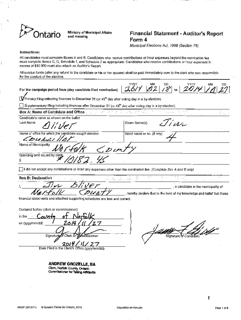 Ministry of Municipal Affairs Ontario and Housing e/financial Statement Auditor\'s Report Form 4 Municipal Elections Act, 1996 (Section 78)Instructions: All candidates must complete Boxes A and B.