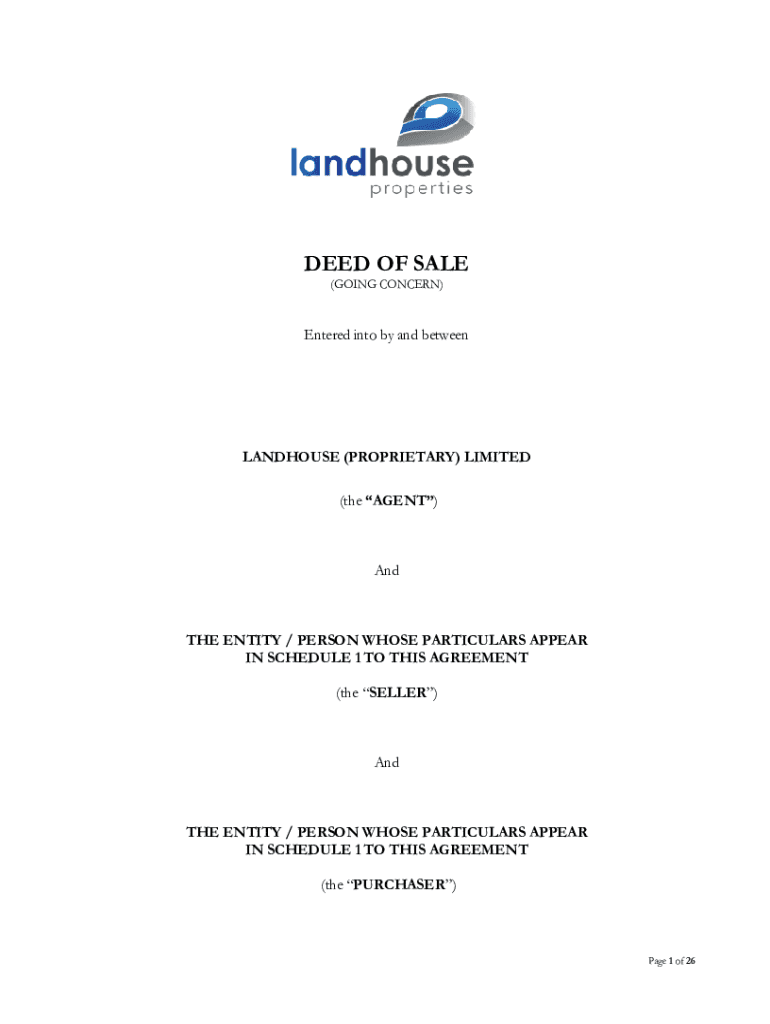 DEED OF SALE (GOING CONCERN)Entered into by and betweenLANDHOUSE (PROPRIETARY) LIMITED (the AGENT)Another ENTITY / PERSON WHOSE PARTICULARS APPEAR IN SCHEDULE 1 TO THIS AGREEMENT (the SELLER)Another