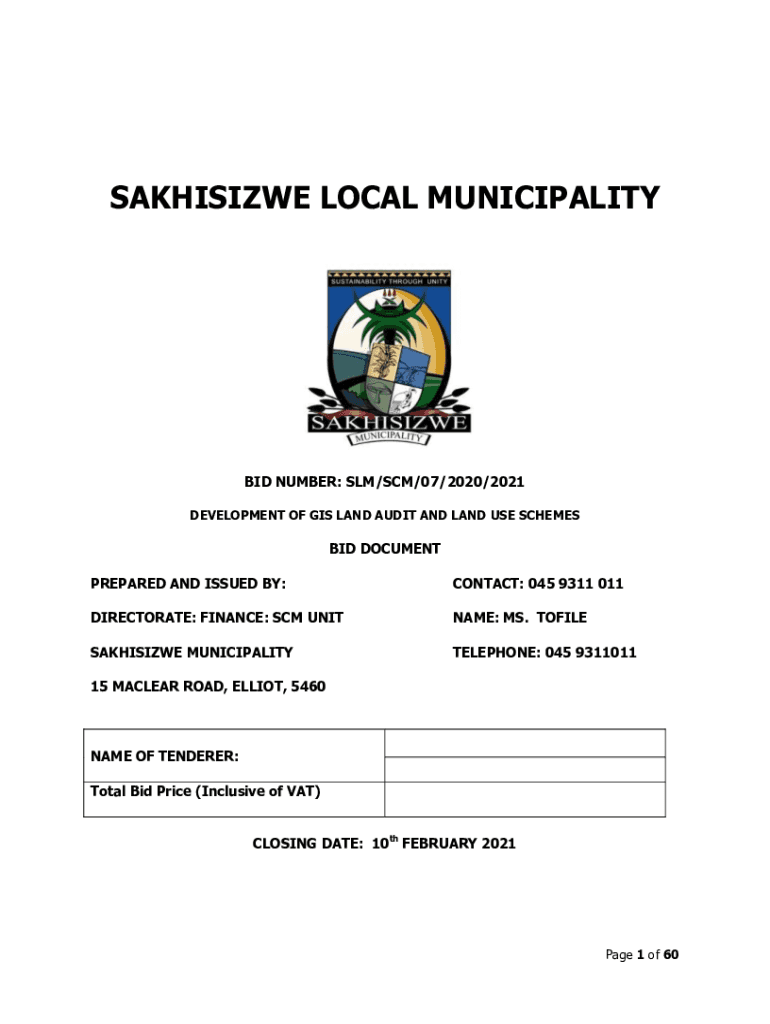 SAKHISIZWE LOCAL MUNICIPALITY BID NUMBER: SUM/SCM/07/2020/2021