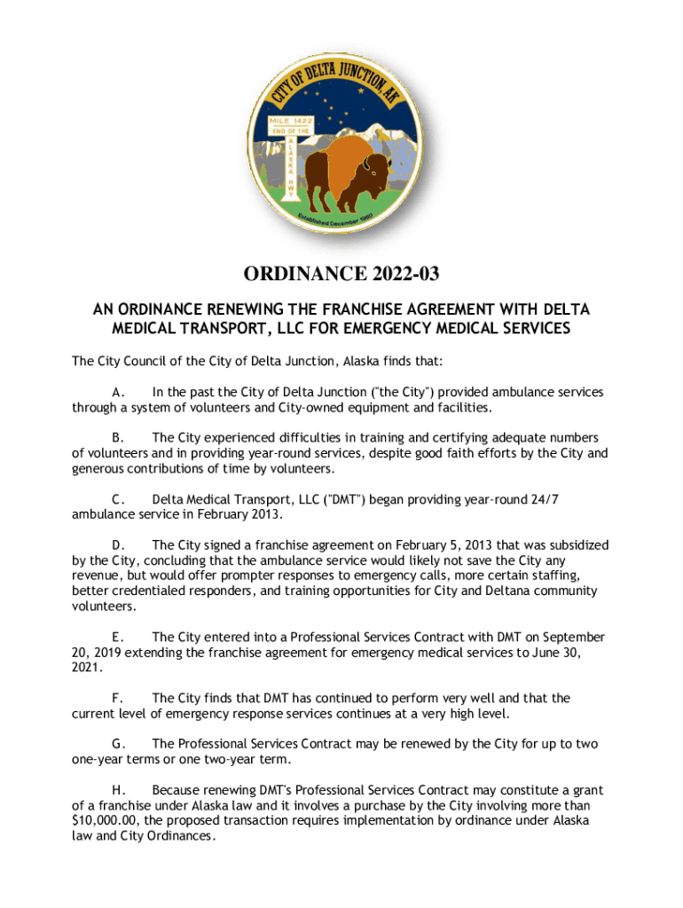 ORDINANCE 202203 AN ORDINANCE RENEWING THE FRANCHISE AGREEMENT WITH DELTA MEDICAL TRANSPORT, LLC FOR EMERGENCY MEDICAL SERVICES The City Council of the City of Delta Junction, Alaska finds that: A.