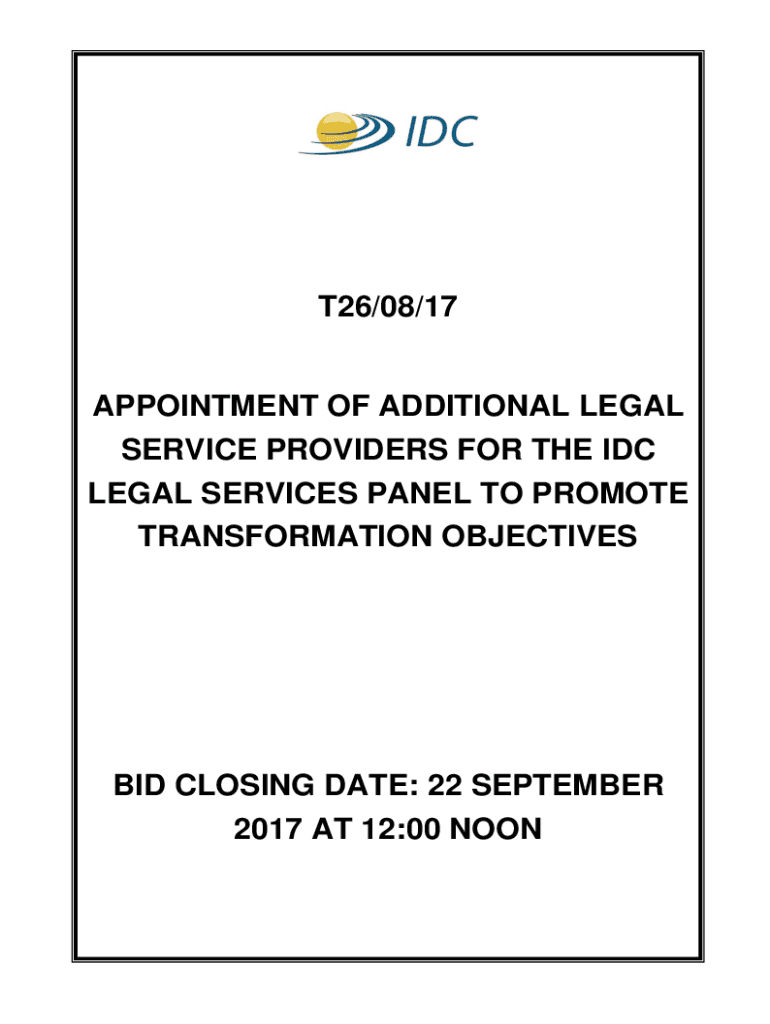 T26/08/17 APPOINTMENT OF ADDITIONAL LEGAL SERVICE PROVIDERS FOR THE IDC LEGAL SERVICES PANEL TO PROMOTE TRANSFORMATION OBJECTIVES BID CLOSING DATE: 22 SEPTEMBER 2017 AT 12:00 Nonindustrial Development