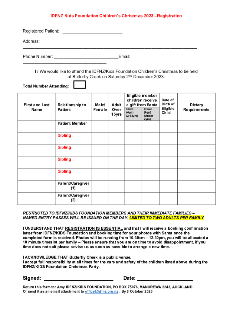 IDF NZ Kids Foundation Children's Christmas 2023 Registration Registered Patient: ___ Address: ___ Phone Number: ___Email: ___ I / We would like to attend the IDF NZ/Kids Foundation Children's Christmas