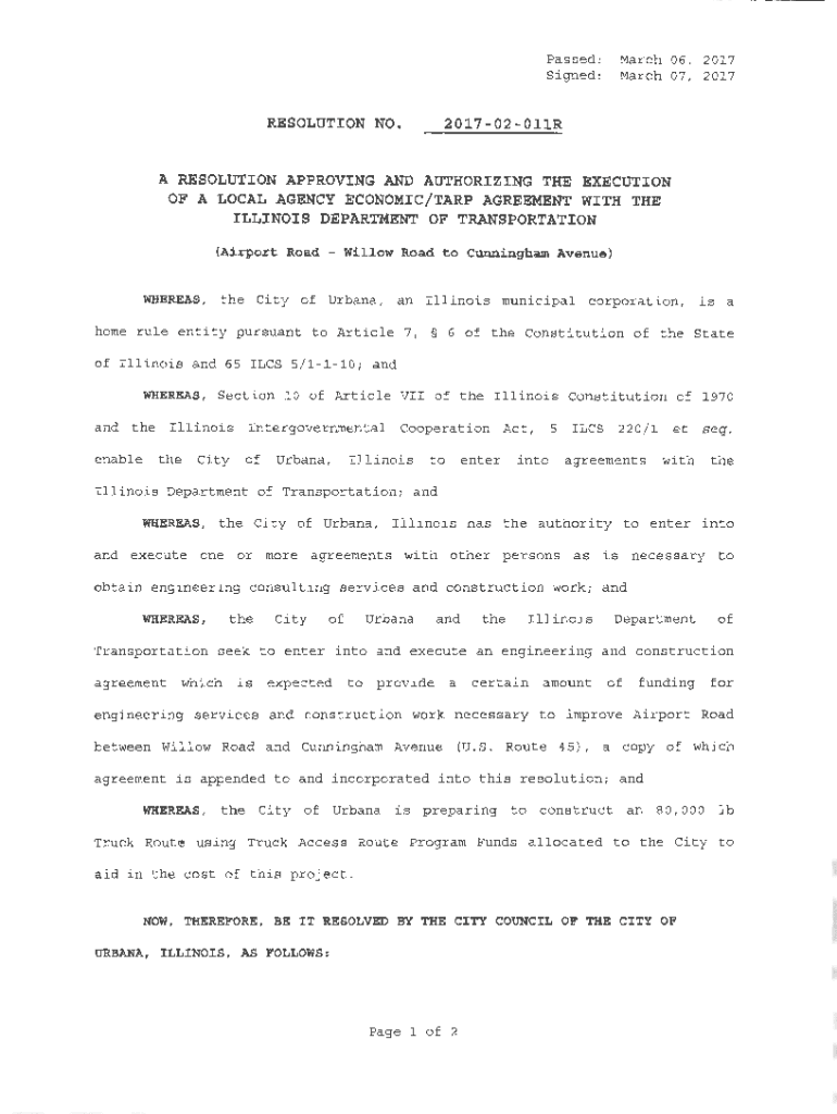 Passed: Signed:RESOLUTION NO. March 06, 2017, March 07, 20172017020llRA RESOLUTION APPROVING AND AUTHORIZING THE EXECUTION OF A LOCAL AGENCY ECONOMIC/TARP AGREEMENT WITH THE ILLINOIS DEPARTMENT OF