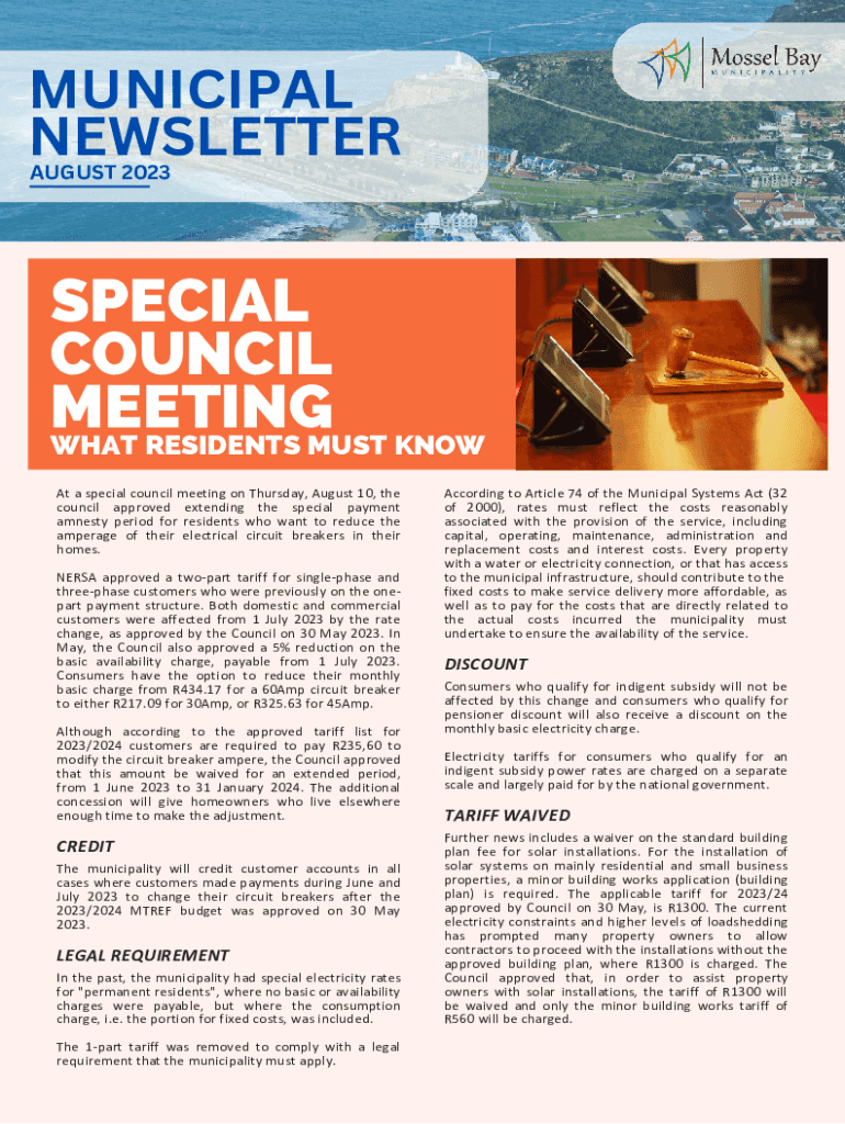 MUNICIPAL NEWSLETTER AUGUST 2023SPECIAL COUNCIL MEETING WHAT RESIDENTS MUST KNOW At a special council meeting on Thursday, August 10, the council approved extending the special payment amnesty period