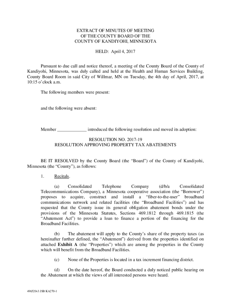 EXTRACT OF MINUTES OF MEETING OF THE COUNTY BOARD OF THE COUNTY OF KANDIYOHI, MINNESOTA HELD: April 4, 2017, Pursuant to do call and notice thereof, a meeting of the County Board of the County of