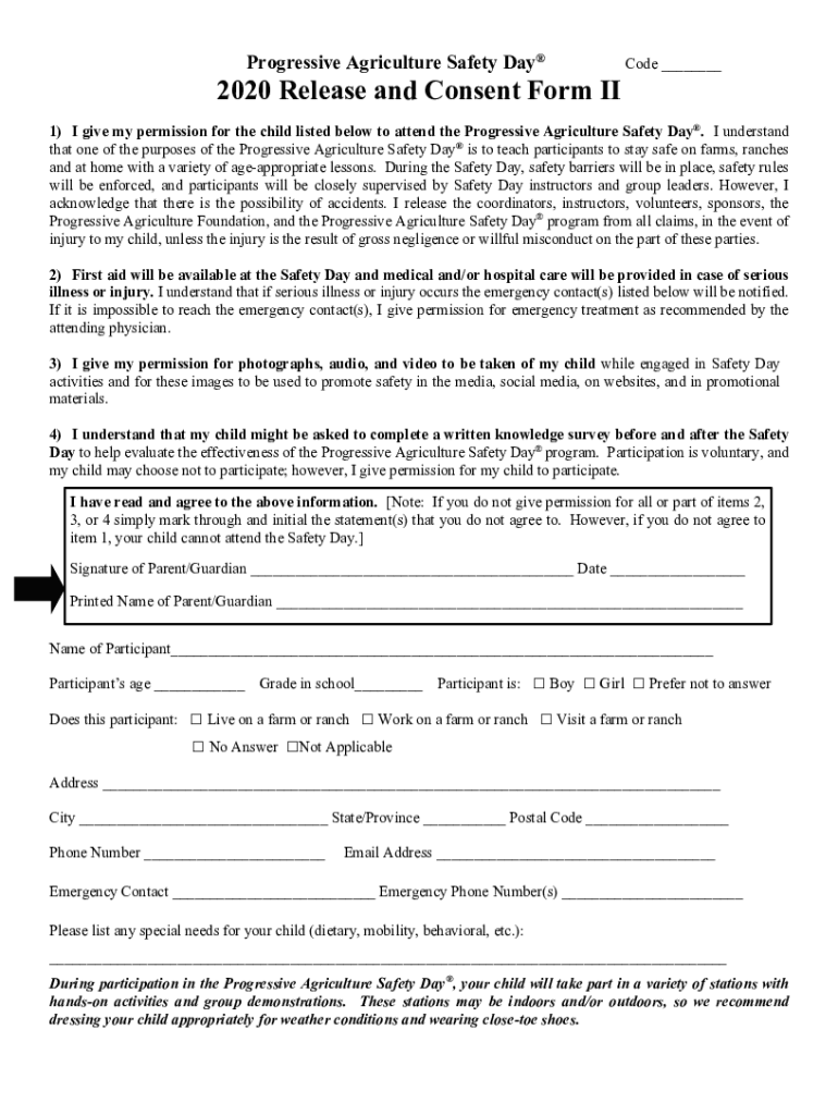 Progressive Agriculture Safety Day2020 Release and Consent Form IIC ode ___1) I give my permission for the child listed below to attend the Progressive Agriculture Safety Day. I understand that one