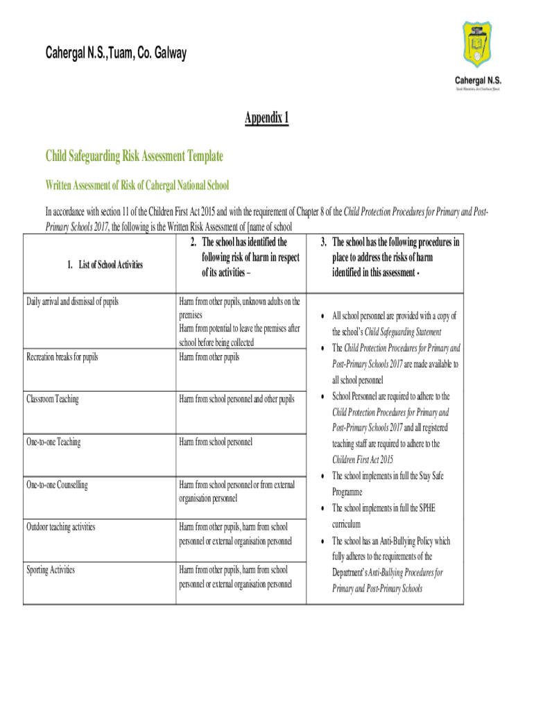 Material N.S., Tuam, Co. GalwayAppendix 1 Child Safeguarding Risk Assessment Template Written Assessment of Risk of Material National School In accordance with section 11 of the Children First Act