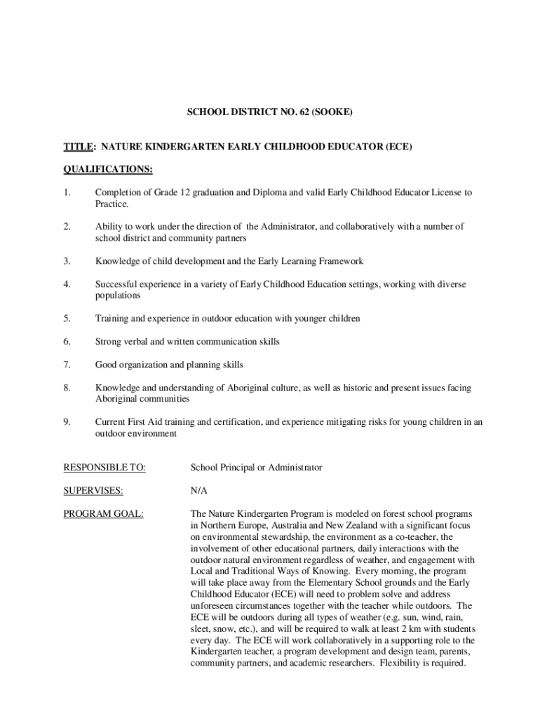 SCHOOL DISTRICT NO. 62 (SPOKE)TITLE: NATURE KINDERGARTEN EARLY CHILDHOOD EDUCATOR (ECE) QUALIFICATIONS: 1. Completion of Grade 12 graduation and Diploma and valid Early Childhood Educator License