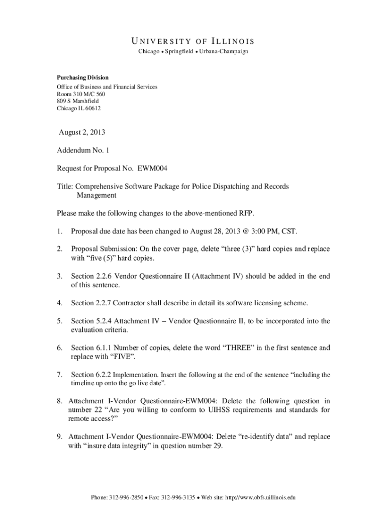 UNIVERSITYOFILLINOISChicago Springfield UrbanaChampaignPurchasing Division Office of Business and Financial Services Room 310 M/C 560 809 S Marsh field Chicago IL 60612August 2, 2013 Addendum No.