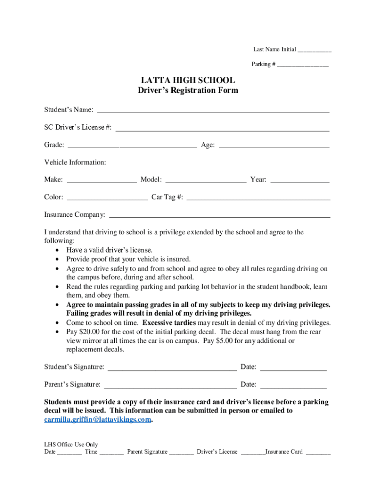Last Name Initial ___ Parking # ___LATTE HIGH SCHOOL Drivers Registration Form Students Name: ___ SC Driver's License #: ___ Grade: ___ Age: ___ Vehicle Information: Make: ___ Model: ___ Year: ___