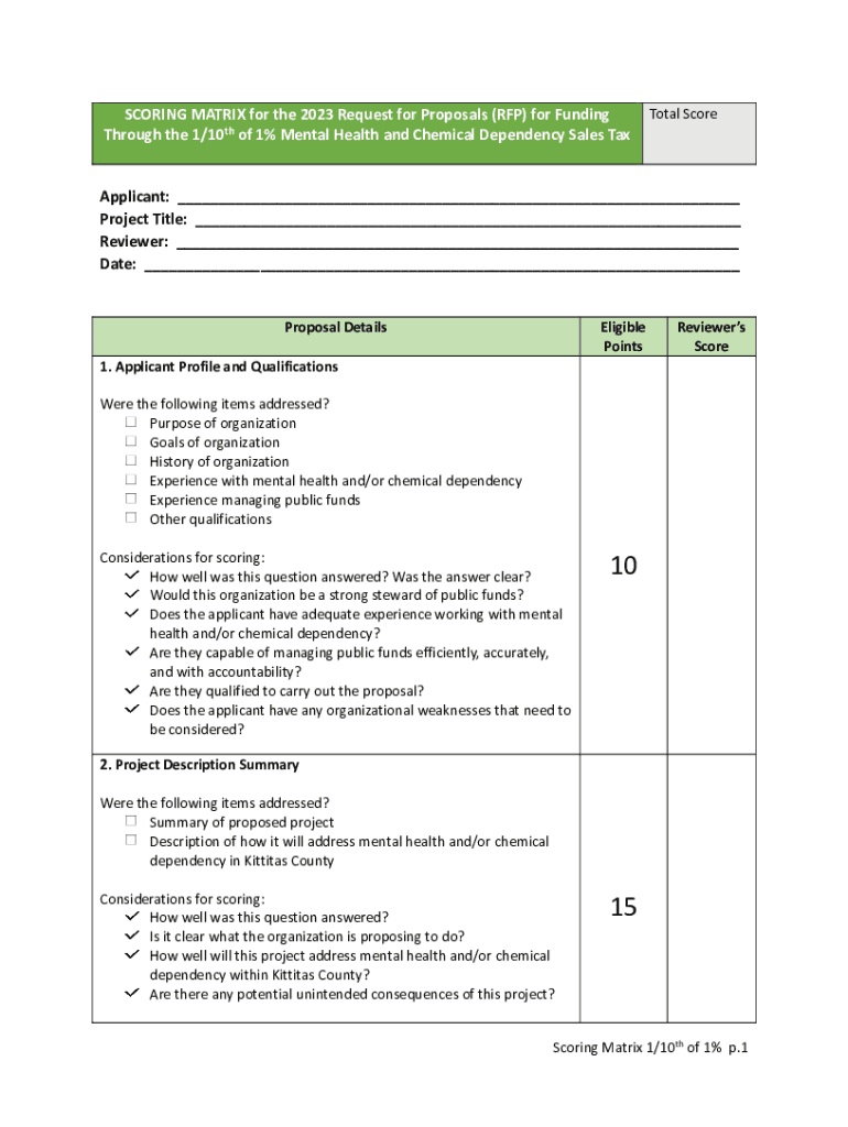 SCORING MATRIX for the 2023 Request for Proposals (RFP) for Funding Through the 1/10th of 1% Mental Health and Chemical Dependency Sales Teetotal ScoreApplicant: ___ Project Title: ___ Reviewer: ___