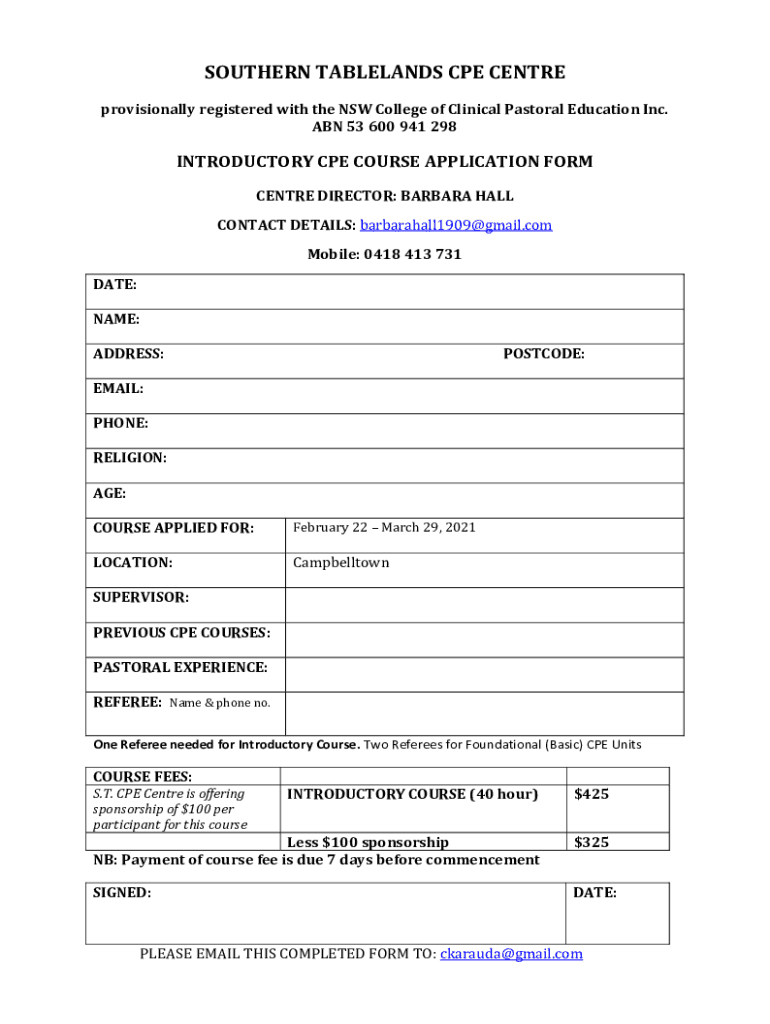 SOUTHERN TABLELANDS CPE Center provisionally registered with the NSW College of Clinical Pastoral Education Inc. ABN 53 600 941 298INTRODUCTORY CPE COURSE APPLICATION FORM Center DIRECTOR: BARBARA