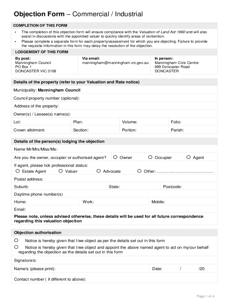Objection Form Commercial / Industrial COMPLETION OF THIS FORM The completion of this objection form will ensure compliance with the Valuation of Land Act 1960 and will also assist in discussions
