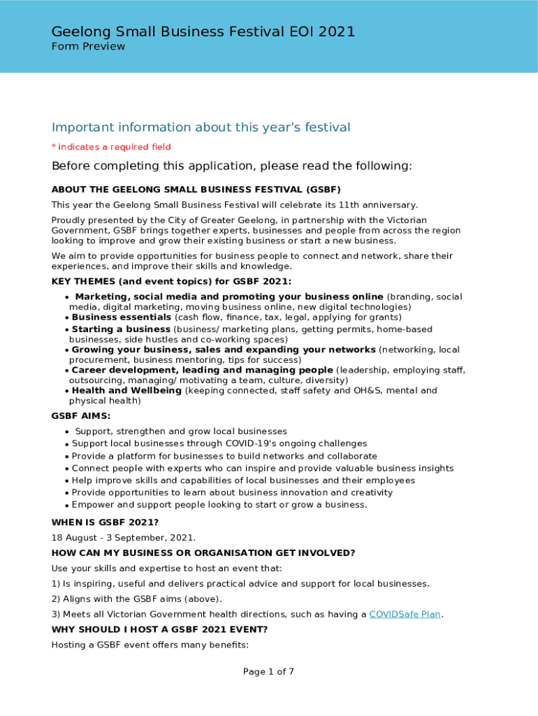 Geelong Small Business Festival EOI 2021 Form PreviewImportant information about this year\'s festival * indicates a required before completing this application, please read the following: ABOUT THE