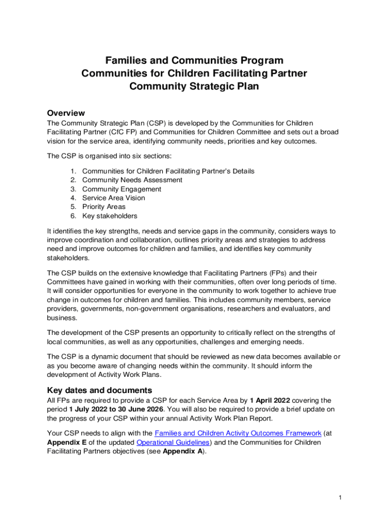 Families and Communities Program Communities for Children Facilitating Partner Community Strategic Plan Overview The Community Strategic Plan (CSP) is developed by the Communities for Children Facilitating