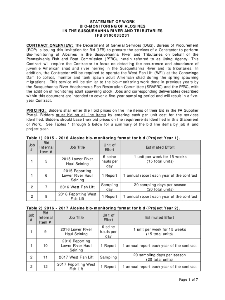 STATEMENT OF WORK BIOMONITORING OF CLOSINGS IN THE SUSQUEHANNA RIVER AND TRIBUTARIES IF 6100035231 CONTRACT OVERVIEW: The Department of General Services (DGS), Bureau of Procurement (BOP) is issuing