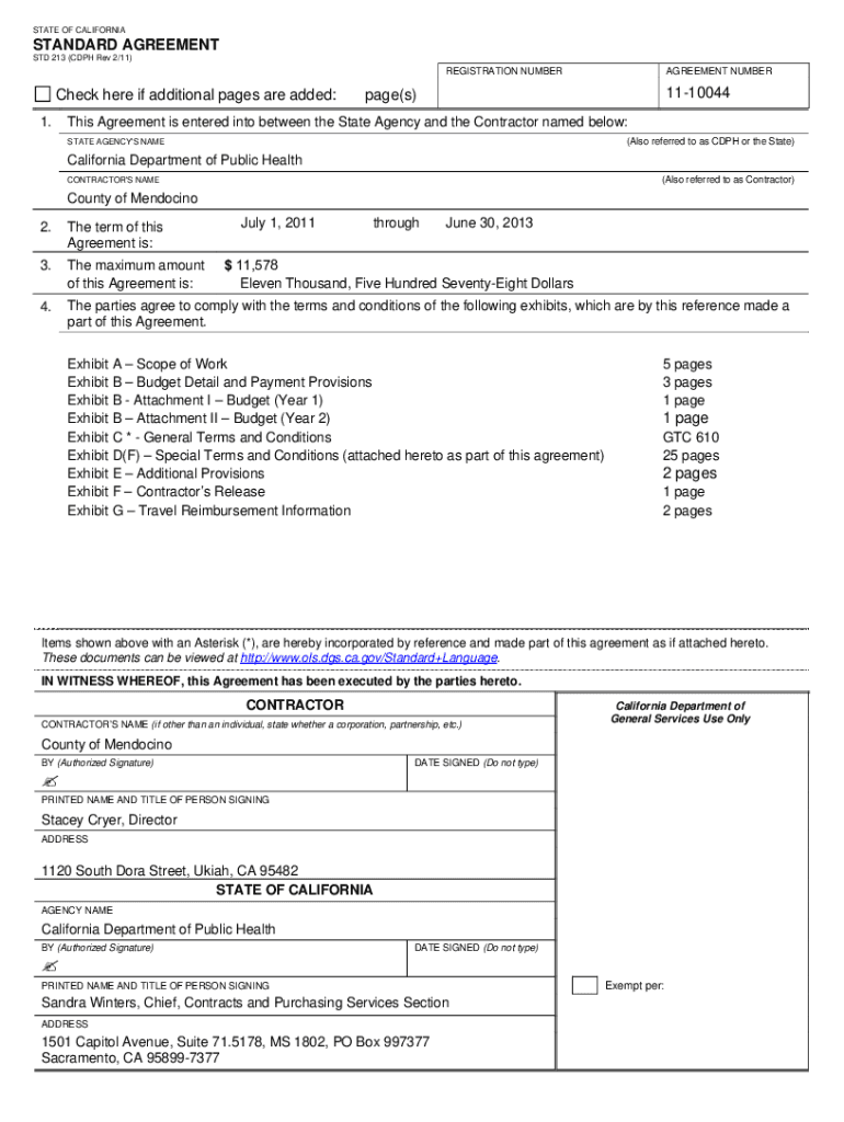 STATE OF CALIFORNIASTANDARD AGREEMENT STD 213 (CDP Rev 2/11)REGISTRATION NUMBERCheck here if additional pages are added: 1.AGREEMENT NUMBER1110044page(s)This Agreement is entered into between the