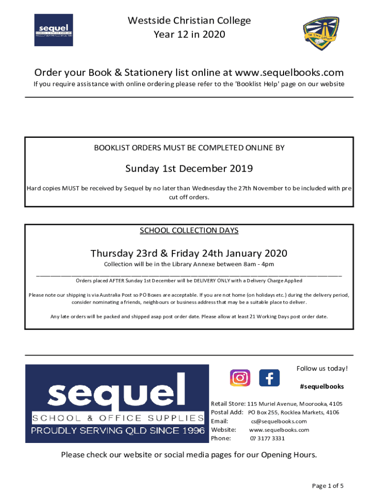 Westside Christian College Year 12 in 2020Order your Book & Stationery list online at www.sequelbooks.com If you require assistance with online ordering please refer to the \'Book list Help\' page