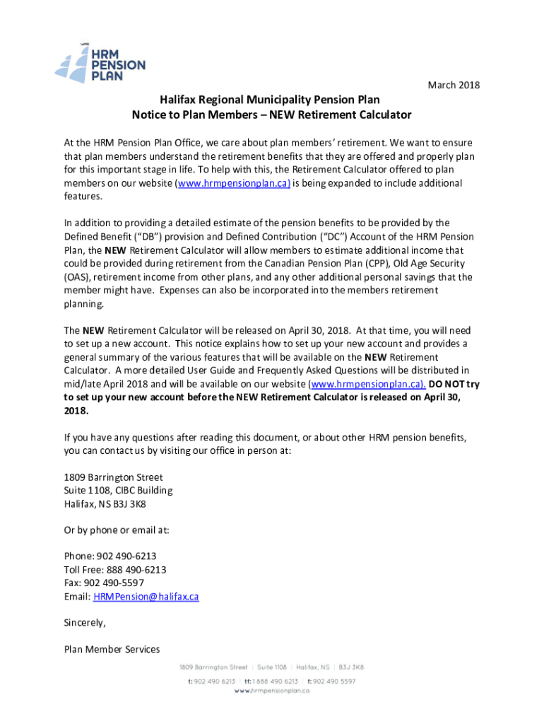 March 2018Halifax Regional Municipality Pension Plan Notice to Plan Members NEW Retirement Calculator At the HRM Pension Plan Office, we care about plan members retirement. We want to ensure that