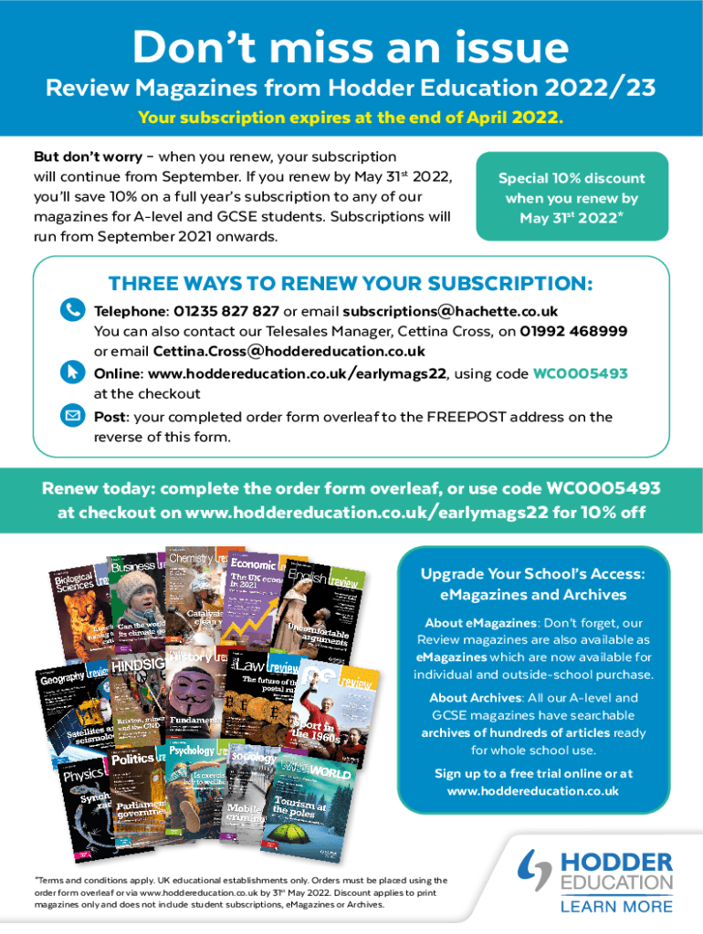 Don't miss an issue Review Magazines from Holder Education 2022/23 Your subscription expires at the end of April 2022. But don't worry when you renew, your subscription will continue from September.