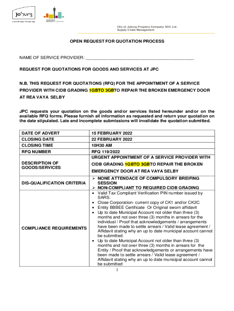 Get the free PROVIDER WITH CIDB GRADING 1GBTO 3GBTO REPAIR THE BROKEN EMERGENCY DOOR - jhbpropert...