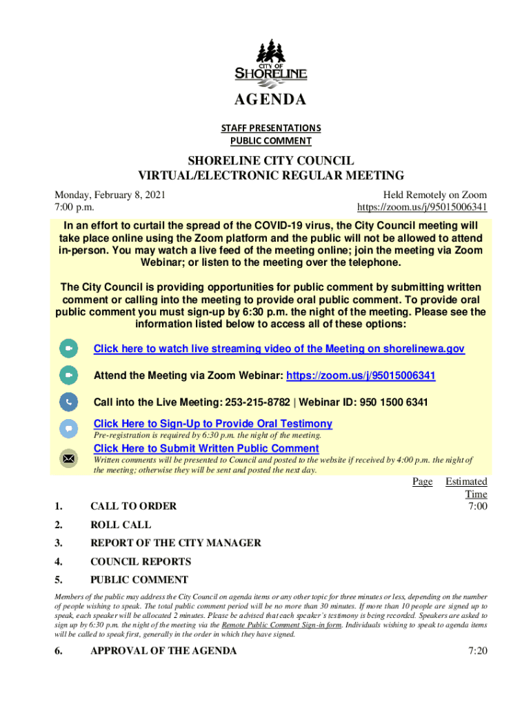 AGENDA STAFF PRESENTATIONS PUBLIC COMMENTSHORELINE CITY COUNCIL VIRTUAL/ELECTRONIC REGULAR MEETING Monday, February 8, 2021 7:00 p.m. Held Remotely on Zoom https://zoom.us/j/95015006341In an effort