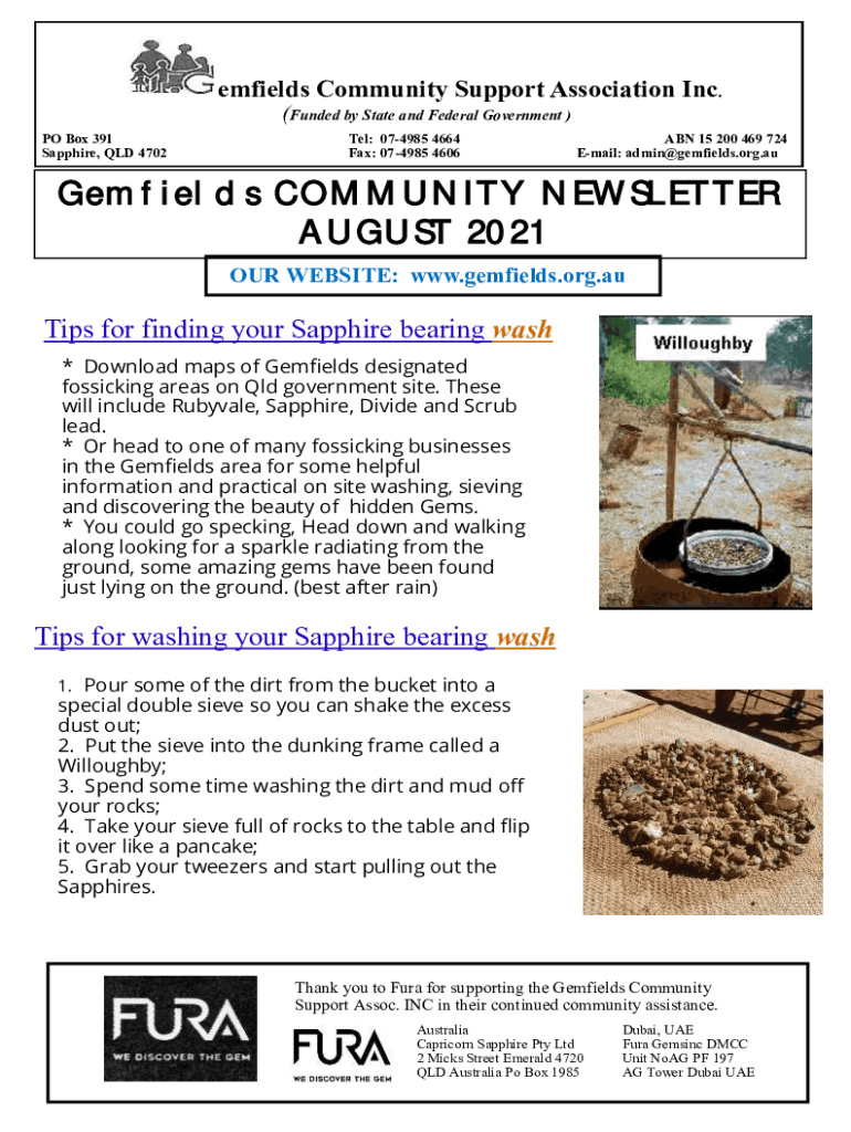 Em fields Community Support Association Inc. (Funded by State and Federal Government)PO Box 391 Sapphire, QLD 4702Tel: 074985 4664 Fax: 074985 4606ABN 15 200 469 724 Email: admin@gemfields.org.auGemfields