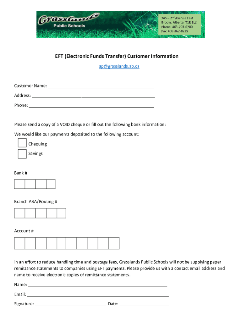 745 2nd Avenue East Brooks, Alberta T1R 1L2 Phone: 4037936700 Fax: 4033628225EFT (Electronic Funds Transfer) Customer Information ap@grasslands.ab.caCustomer Name: ___ Address: ___ Phone: ___Please